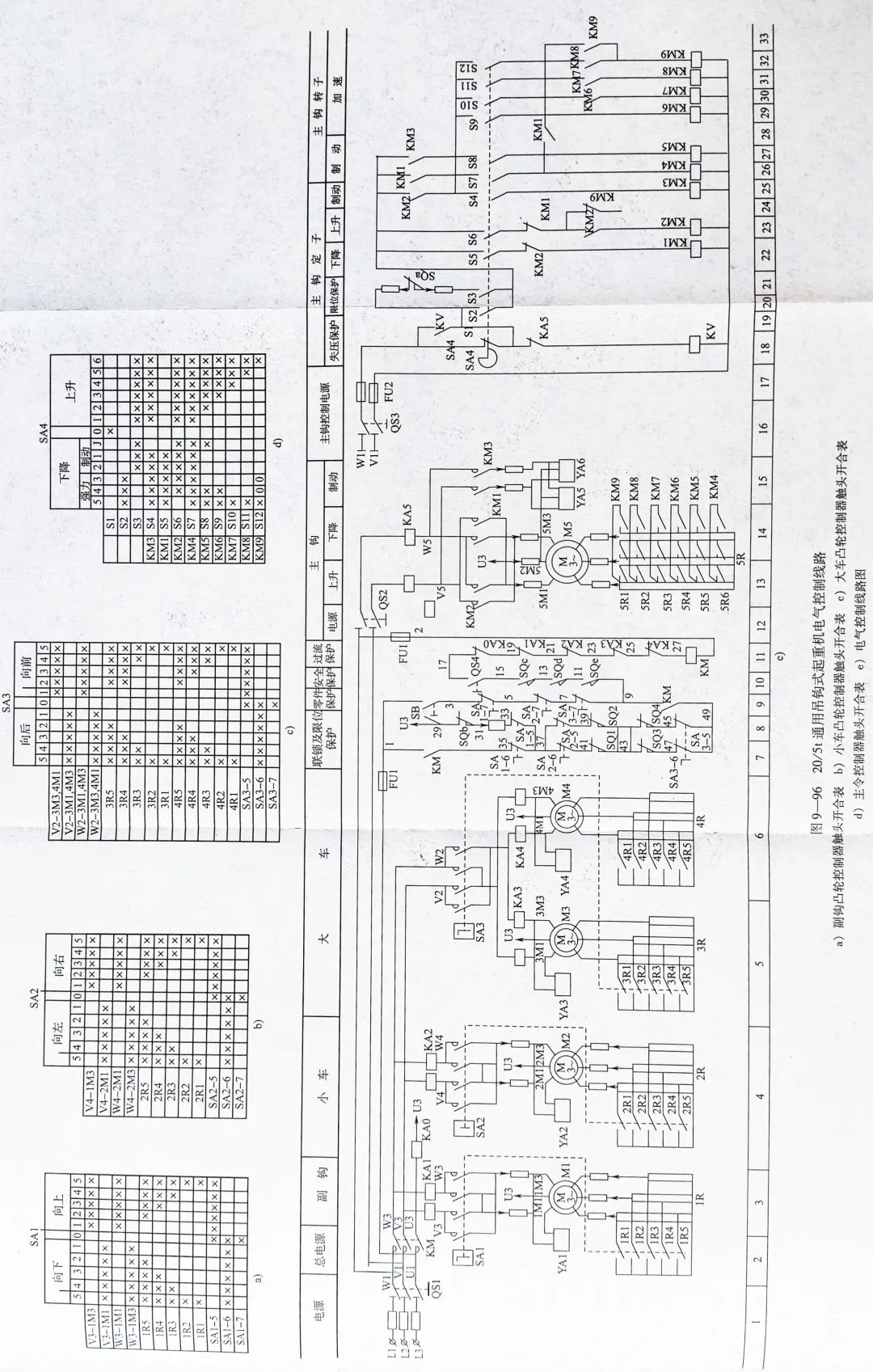 副鉤的控制采用的是凸輪控制器SA1,它有10個(gè)擋位,上升、下降各有五個(gè)擋位;采用對(duì)稱接法,即控制器手柄處在正轉(zhuǎn)和反轉(zhuǎn)的相應(yīng)位置時(shí),電動(dòng)機(jī)的工作情況完全相同。正轉(zhuǎn)的上1擋位為預(yù)備擋,手柄位于上2、上3、上4、上5擋位時(shí)電動(dòng)機(jī)轉(zhuǎn)速逐漸上升。下降的五個(gè)擋位,如果是輕載則電動(dòng)機(jī)工作在強(qiáng)力下放的狀態(tài),若是重載則電動(dòng)機(jī)工作在回饋制動(dòng)狀態(tài),如圖9-98所示。